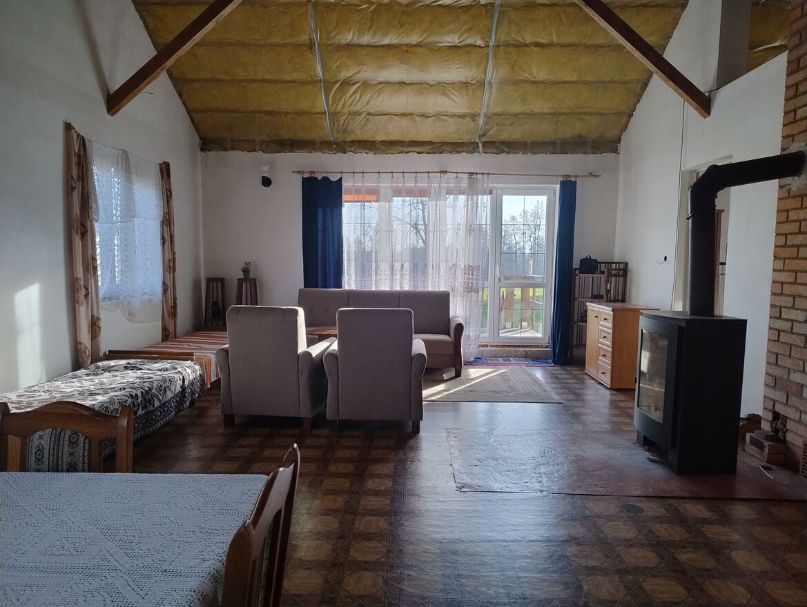 W środku duży salon, ustawna sypialnia z gustownymi belkami, łazienka i oddzielna kuchnia.